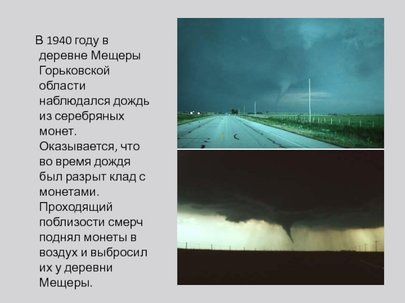 дождь из серебряных монет. Оказывается, что во время дождя был разрыт клад с монетами. Проходящий поблизости смерч поднял монеты в воздух и выбросил их у деревни Мещеры.