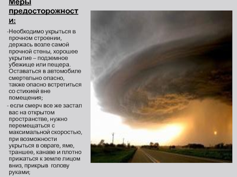 хорошее укрытие – подземное убежище или пещера. Оставаться в автомобиле смертельно опасно, также опасно встретиться со стихией вне помещения;