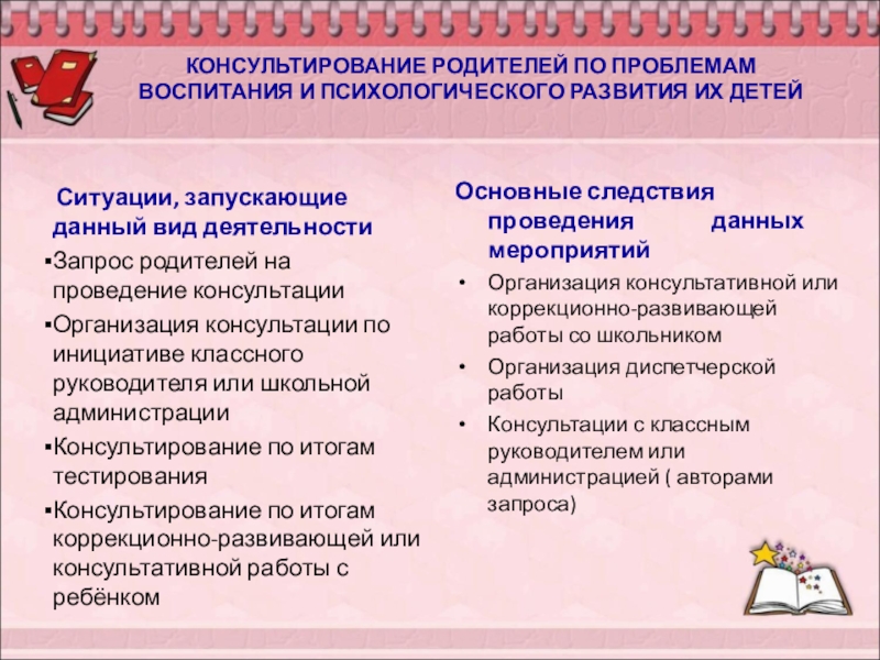 КОНСУЛЬТИРОВАНИЕ РОДИТЕЛЕЙ ПО ПРОБЛЕМАМ ВОСПИТАНИЯ И ПСИХОЛОГИЧЕСКОГО РАЗВИТИЯ ИХ ДЕТЕЙ