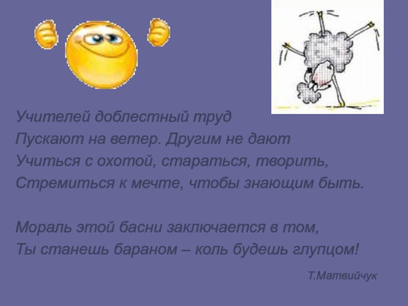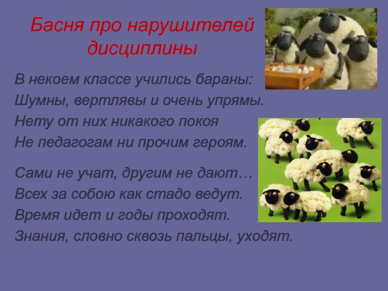 Басня про нарушителей дисциплиныВ некоем классе учились бараны:Шумны, вертлявы и очень упрямы. Нету от них никакого покоя