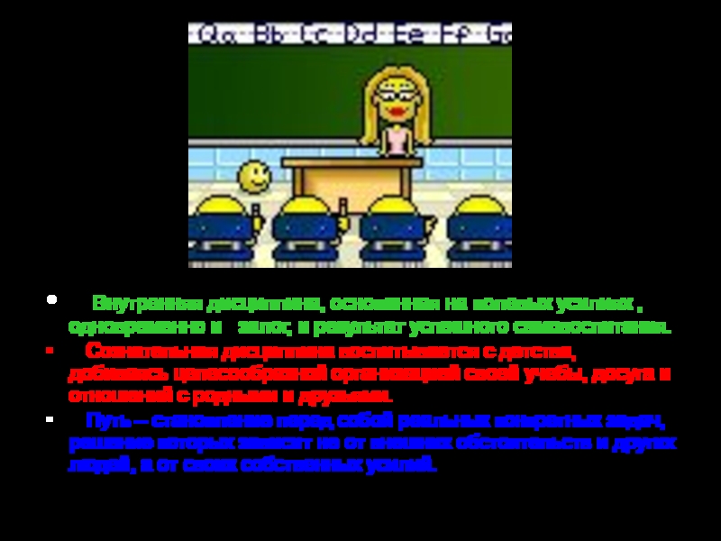 Дисциплина  Внутренняя дисциплина, основанная на волевых усилиях ,одновременно и  залог, и результат успешного самовоспитания.