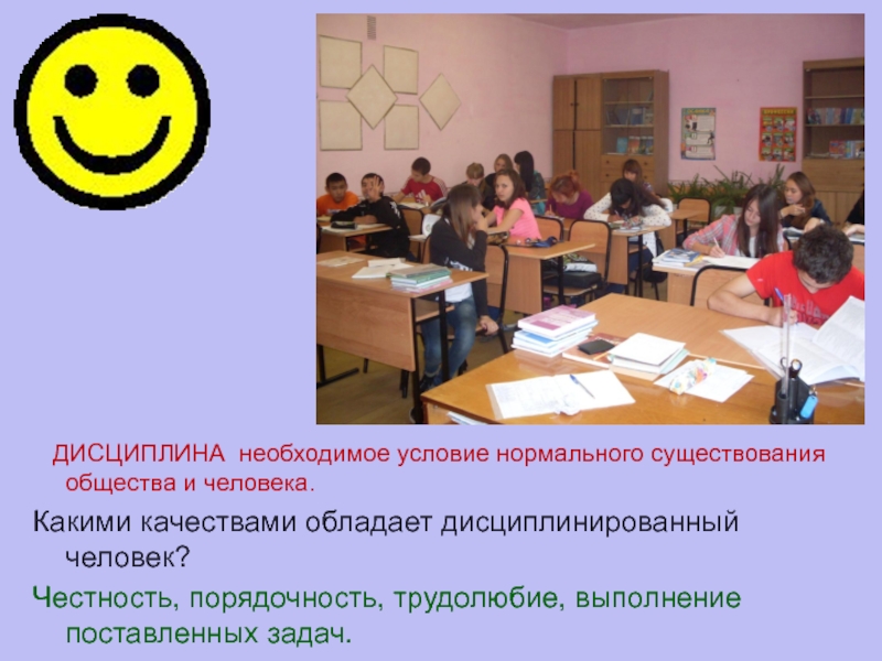 ДИСЦИПЛИНА необходимое условие нормального существования общества и человека.Какими качествами обладает дисциплинированный человек?Честность, порядочность, трудолюбие, выполнение