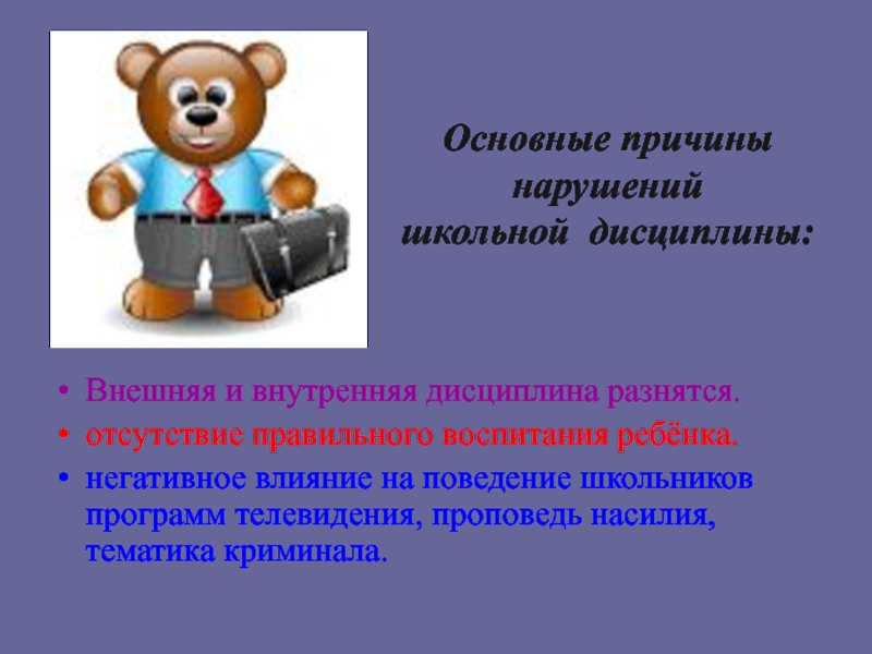 Слайд 8Основные причины нарушений школьной  дисциплины: