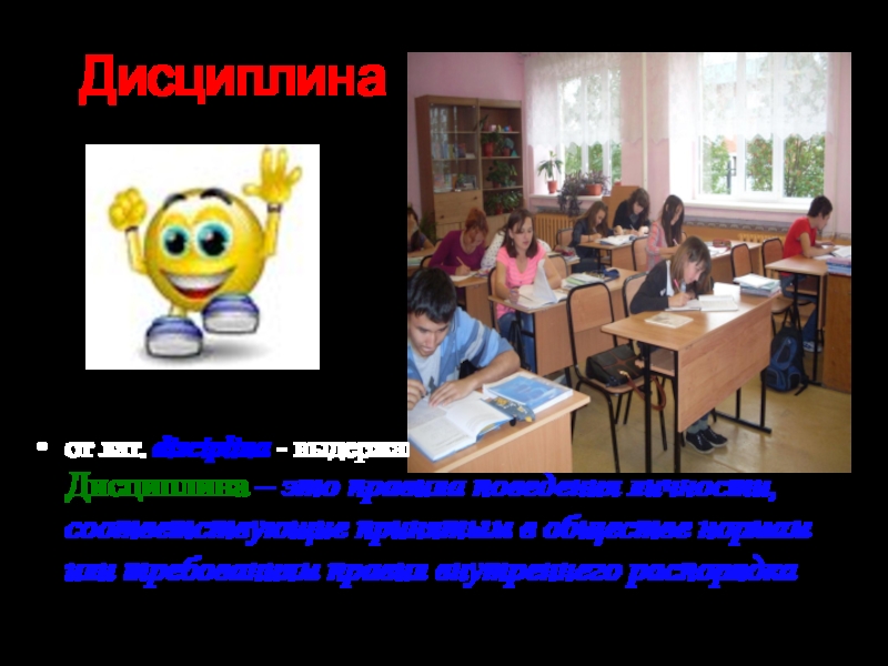 Дисциплинаот лат. disciplina - выдержанность, строгость  Дисциплина – это правила поведения личности, соответствующие принятым в обществе