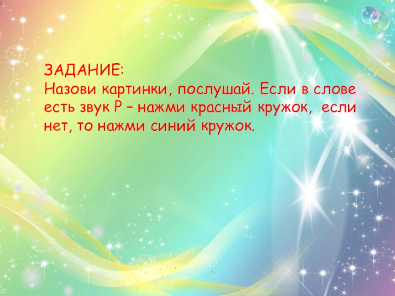 ЗАДАНИЕ:Назови картинки, послушай. Если в слове есть звук Р – нажми красный кружок, если нет, то нажми