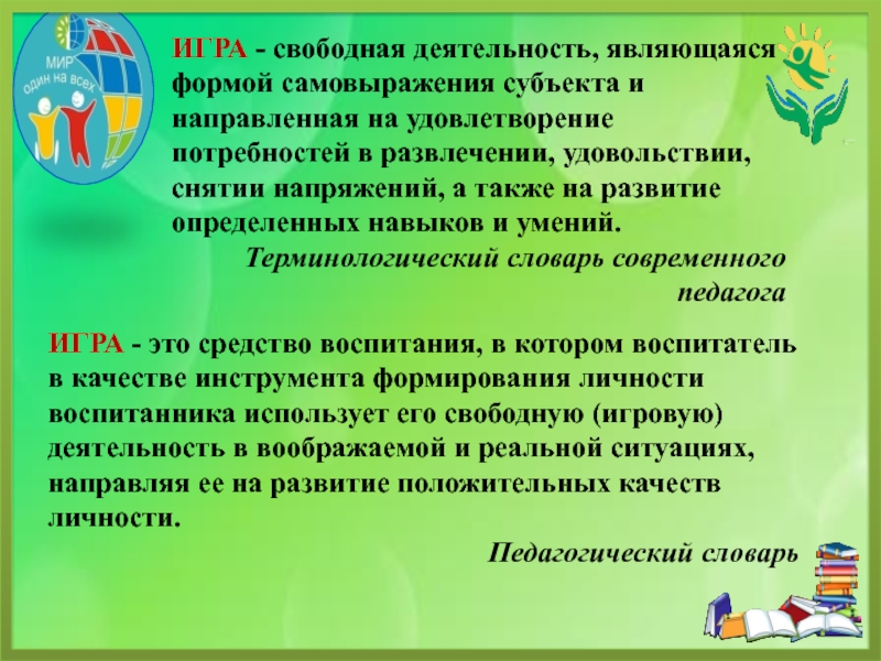 ИГРА - это средство воспитания, в котором воспитатель в качестве инструмента формирования личности воспитанника использует его свободную (игровую) деятельность в воображаемой и реальной ситуациях, направляя ее на развитие положительных качеств личности.