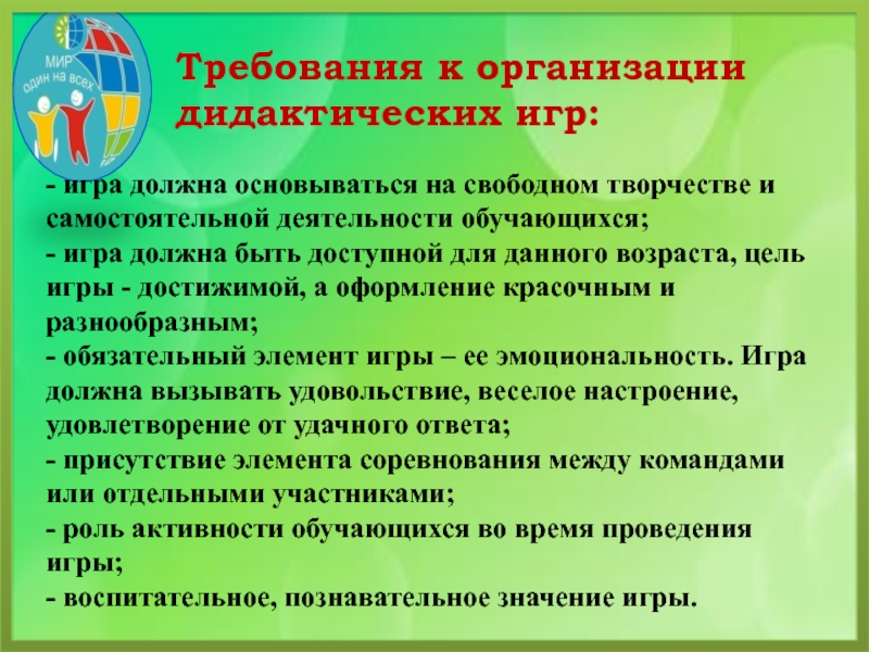 Требования к организации дидактических игр: