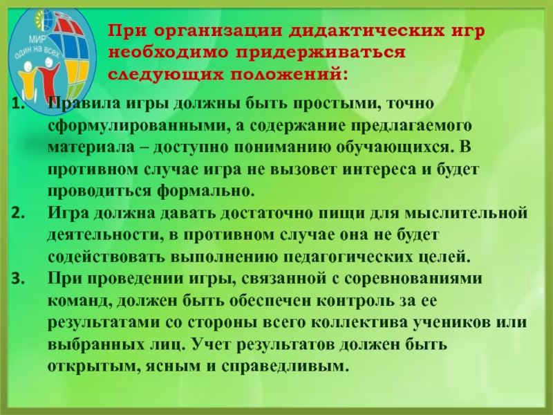 При организации дидактических игр необходимо придерживаться следующих положений: