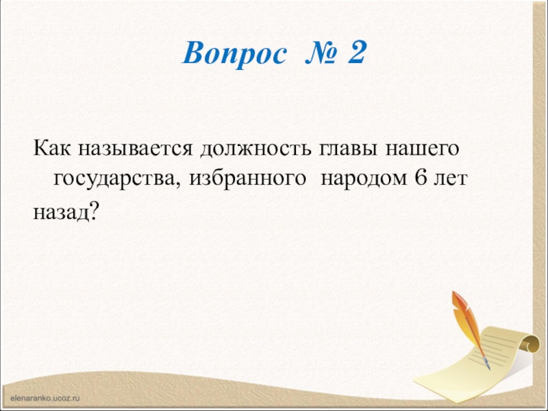 Вопрос № 2Как называется должность главы нашего государства, избранного народом 6 летназад?