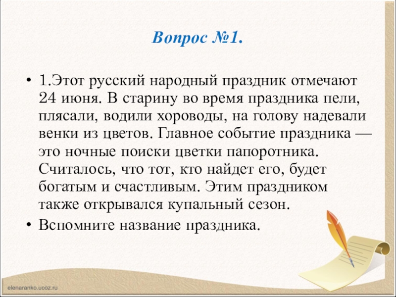 Вопрос №1.1.Этот русский народный праздник отмечают 24 июня. В старину во время праздника пели, плясали, водили хороводы, на голову надевали венки из цветов. Главное событие праздника — это ночные поиски цветки папоротника. Считалось, что тот, кто