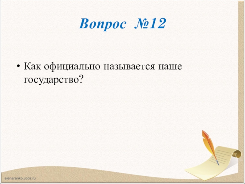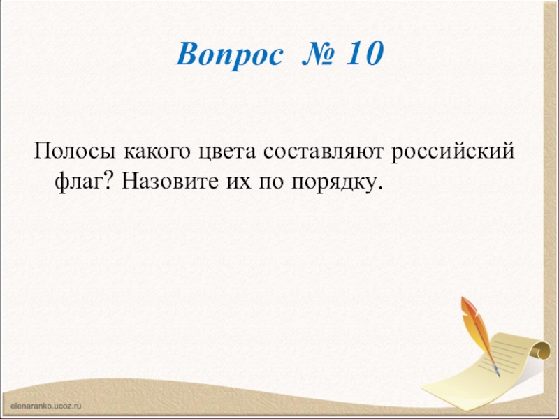 Вопрос № 10Полосы какого цвета составляют российский флаг? Назовите их по порядку.