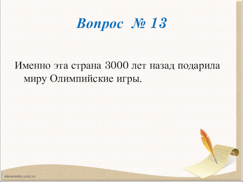Вопрос № 13Именно эта страна 3000 лет назад подарила миру Олимпийские игры.
