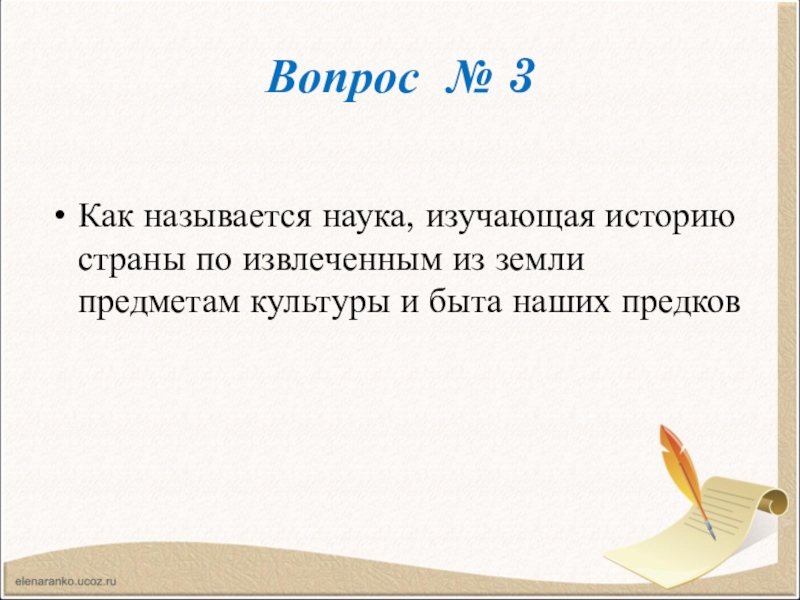 Вопрос № 3Как называется наука, изучающая историю страны по извлеченным из земли предметам культуры и быта наших