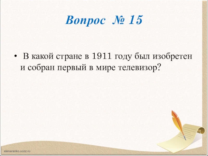 Вопрос № 15 В какой стране в 1911 году был изобретен и собран первый в мире телевизор?