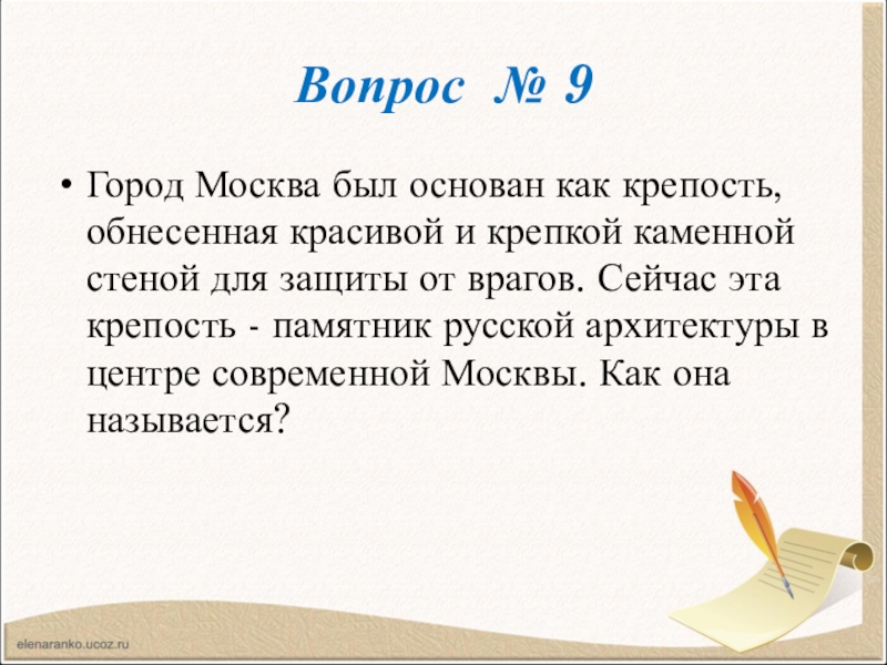 Вопрос № 9Город Москва был основан как крепость, обнесенная красивой и крепкой каменной стеной для защиты от