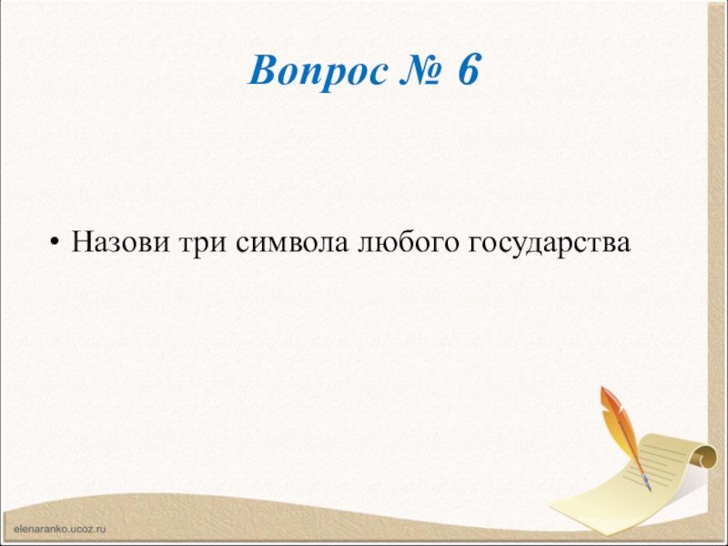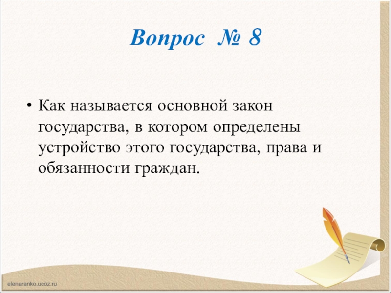 Вопрос № 8Как называется основной закон государства, в котором определены устройство этого государства, права и обязанности граждан.