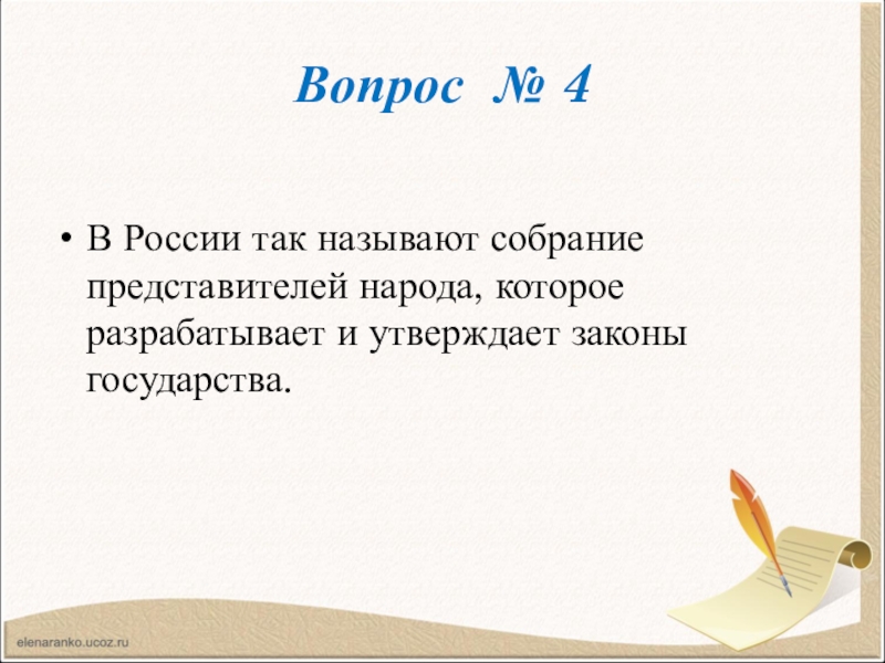 Вопрос № 4В России так называют собрание представителей народа, которое разрабатывает и утверждает законы государства.