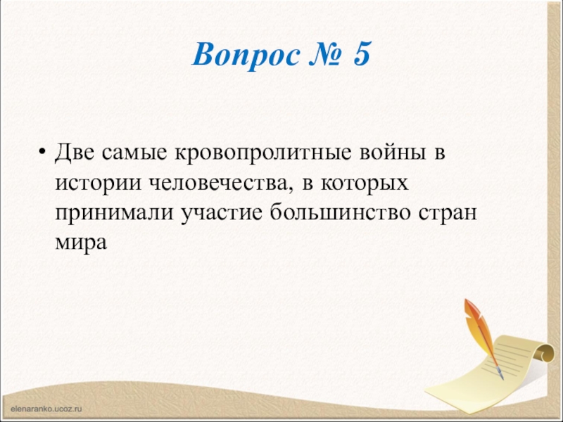 Вопрос № 5Две самые кровопролитные войны в истории человечества, в которых принимали участие большинство стран мира
