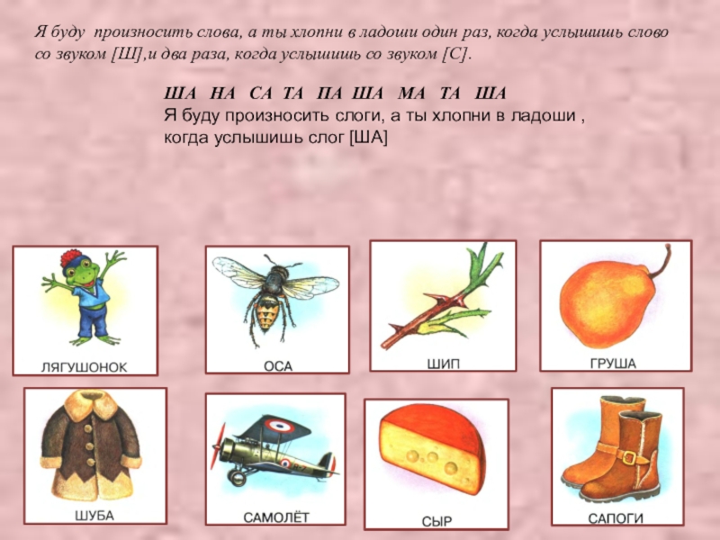 Я буду произносить слоги, а ты хлопни в ладоши , когда услышишь слог [ША]