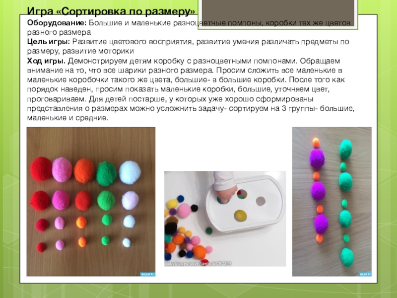 Ход игры. Демонстрируем детям коробку с разноцветными помпонами. Обращаем внимание на то, что все шарики разного размера. Просим сложить все маленькие в маленькие коробочки такого же цвета, большие- в большие коробки. После того как порядок наведен, просим показать маленькие коробки, большие, уточняем цвет, проговариваем. Для детей постарше, у которых уже хорошо сформированы представления о размерах можно усложнить задачу- сортируем на 3 группы- большие, маленькие и средние.