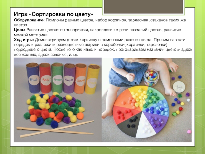 Ход игры: Демонстрируем детям корзинку с помпонами разного цвета. Просим навести порядок и разложить разноцветные шарики в коробочки( корзинки, тарелочки) подходящего цвета. После того как навели порядок, проговариваем названия цветов- здесь все желтые, здесь зеленые, и.т.д.