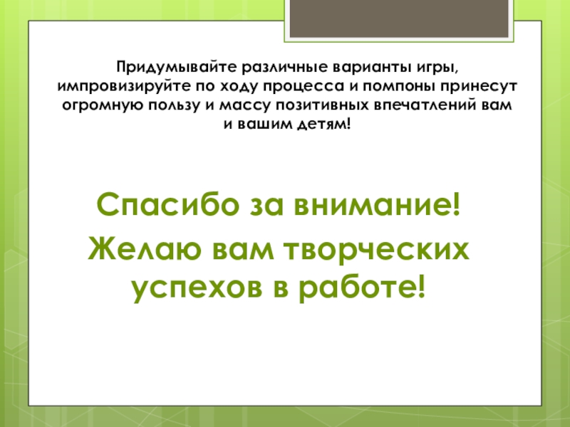 Слайд 10Придумывайте различные варианты игры, импровизируйте по ходу процесса и помпоны принесут