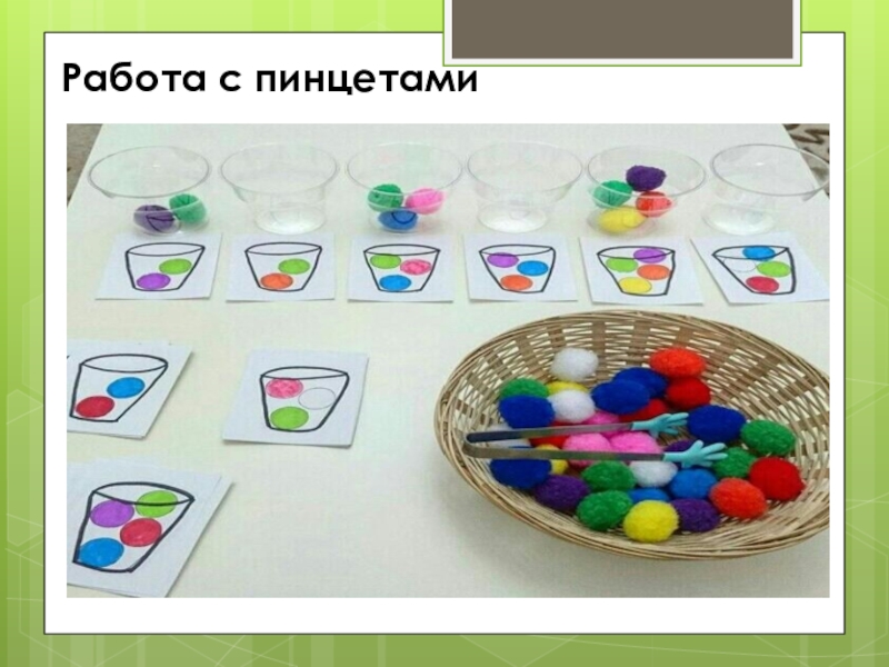 Оборудование: Помпоны разных цветов, набор корзинок, тарелочек ,стаканов