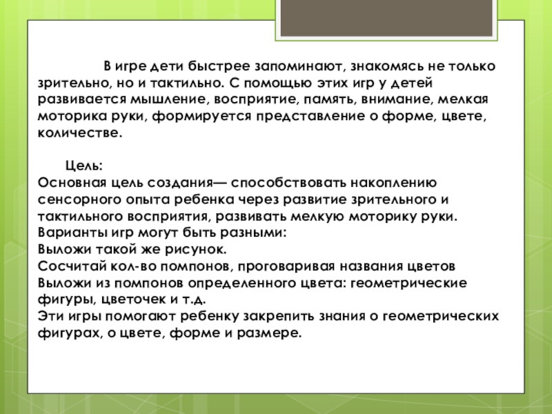 дети быстрее запоминают, знакомясь не только зрительно, но и тактильно. С помощью этих игр у детей развивается мышление, восприятие, память, внимание, мелкая моторика руки, формируется представление о форме, цвете, количестве.