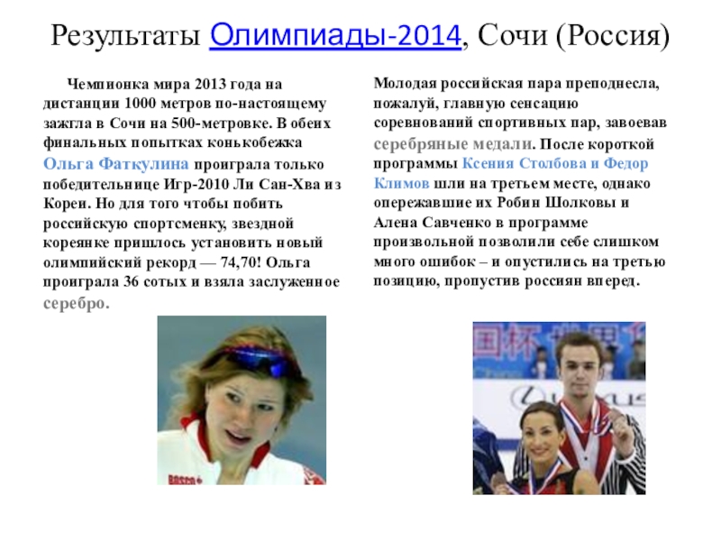 Молодая российская пара преподнесла, пожалуй, главную сенсацию соревнований спортивных пар, завоевав серебряные медали. После короткой программы Ксения Столбова и Федор Климов шли на третьем месте, однако опережавшие их Робин Шолковы и Алена Савченко в программе произвольной позволили себе слишком много ошибок – и опустились на третью позицию, пропустив россиян вперед.