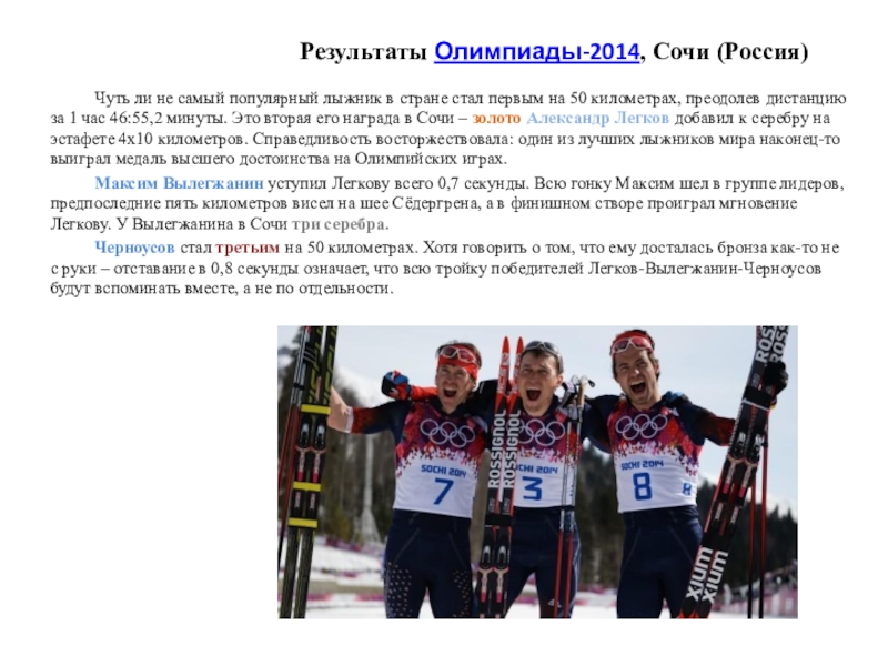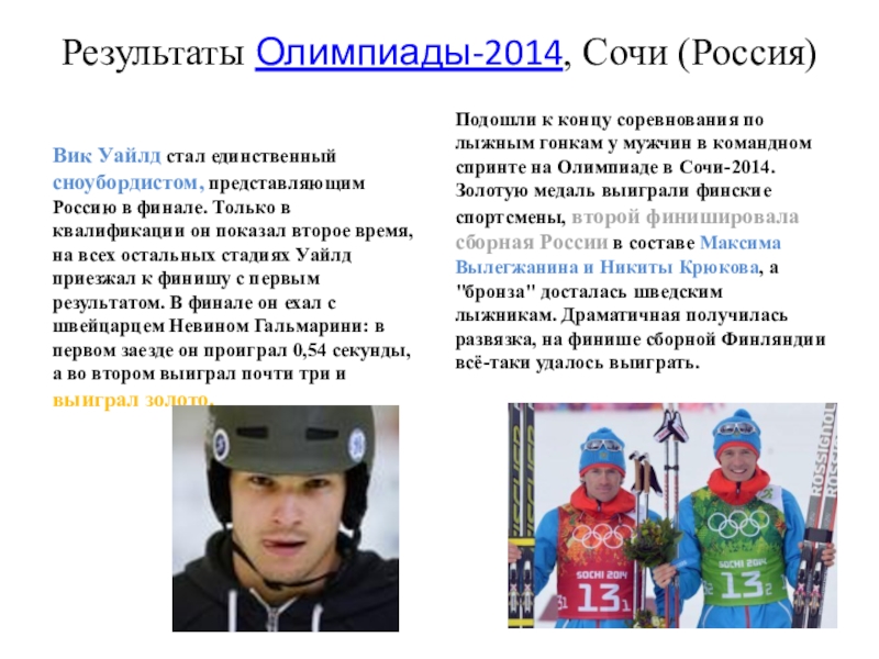 Подошли к концу соревнования по лыжным гонкам у мужчин в командном спринте на Олимпиаде в Сочи-2014. Золотую медаль выиграли финские спортсмены, второй финишировала сборная России в составе Максима Вылегжанина и Никиты Крюкова, а "бронза" досталась шведским лыжникам. Драматичная получилась развязка, на финише сборной Финляндии всё-таки удалось выиграть.