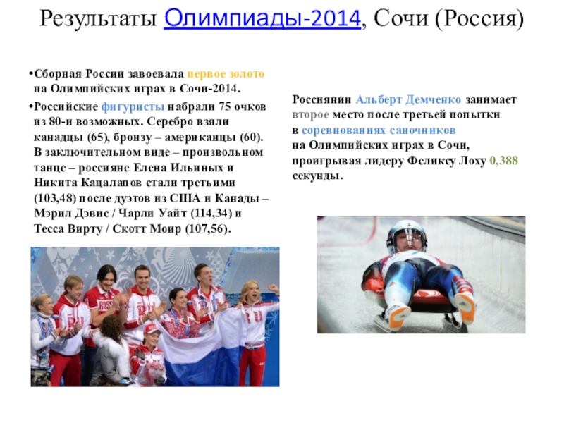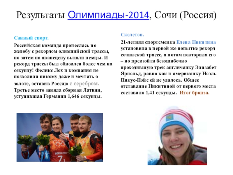 21-летняя спортсменка Елена Никитина установила в первой же попытке рекорд сочинской трассе, а потом повторила его – но превзойти безошибочно проходившую трек англичанку Элизабет Ярнольд, равно как и американку Ноэль Пикус-Пэйс ей не удалось. Общее отставание Никитиной от первого места составило 1,41 секунды. Итог бронза.