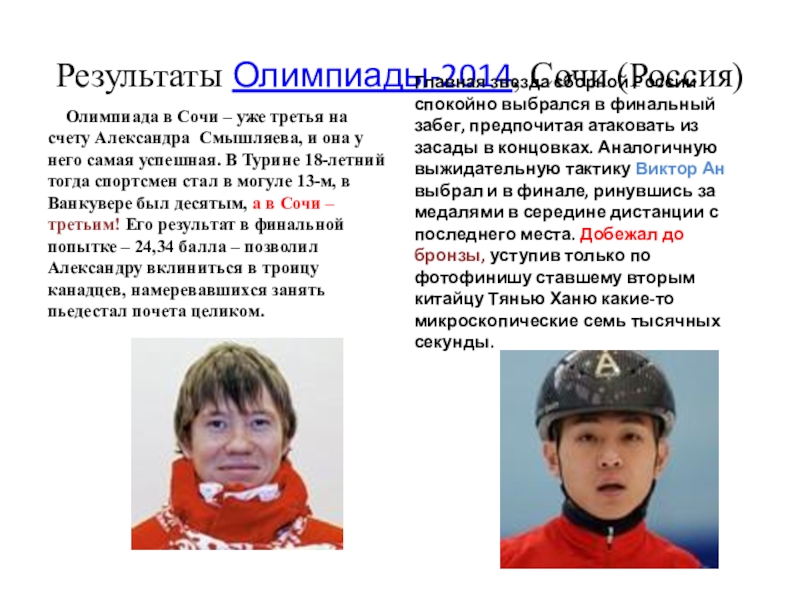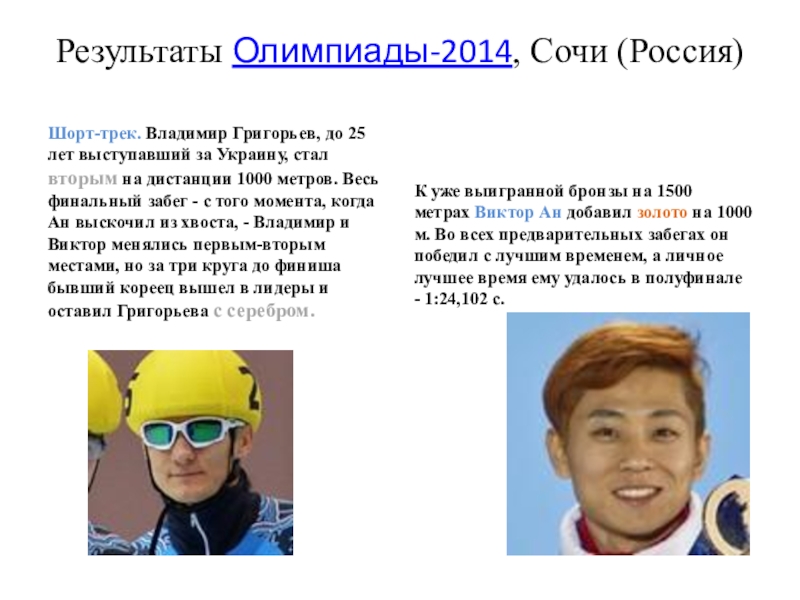 Шорт-трек. Владимир Григорьев, до 25 лет выступавший за Украину, стал вторым на дистанции 1000 метров. Весь финальный забег - с того момента, когда Ан выскочил из хвоста, - Владимир и Виктор менялись первым-вторым местами, но за три круга до финиша бывший кореец вышел в лидеры и оставил Григорьева с серебром.