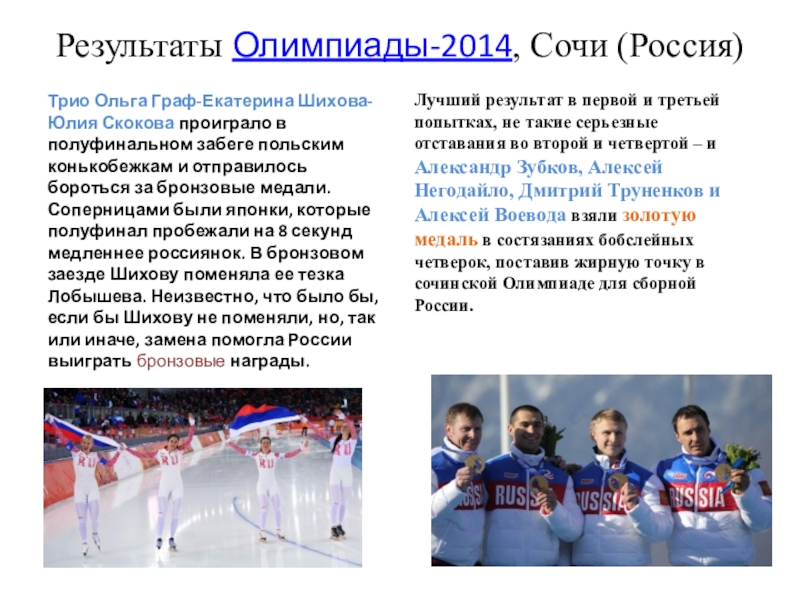 Лучший результат в первой и третьей попытках, не такие серьезные отставания во второй и четвертой – и Александр Зубков, Алексей Негодайло, Дмитрий Труненков и Алексей Воевода взяли золотую медаль в состязаниях бобслейных четверок, поставив жирную точку в сочинской Олимпиаде для сборной России.