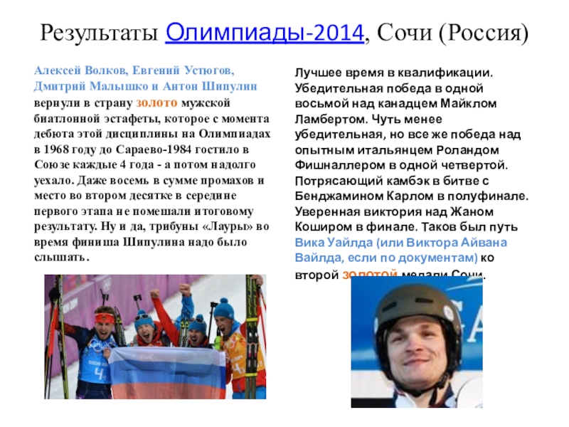 Лучшее время в квалификации. Убедительная победа в одной восьмой над канадцем Майклом Ламбертом. Чуть менее убедительная, но все же победа над опытным итальянцем Роландом Фишналлером в одной четвертой. Потрясающий камбэк в битве с Бенджамином Карлом в полуфинале. Уверенная виктория над Жаном Коширом в финале. Таков был путь Вика Уайлда (или Виктора Айвана Вайлда, если по документам) ко второй золотой медали Сочи.