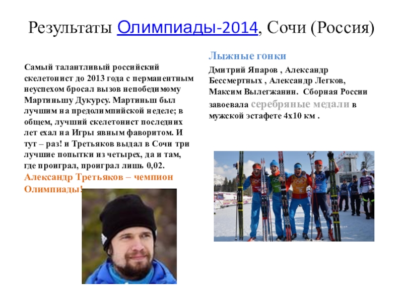 Дмитрий Япаров , Александр Бессмертных , Александр Легков, Максим Вылегжанин. Сборная России завоевала серебряные медали в мужской эстафете 4х10 км .