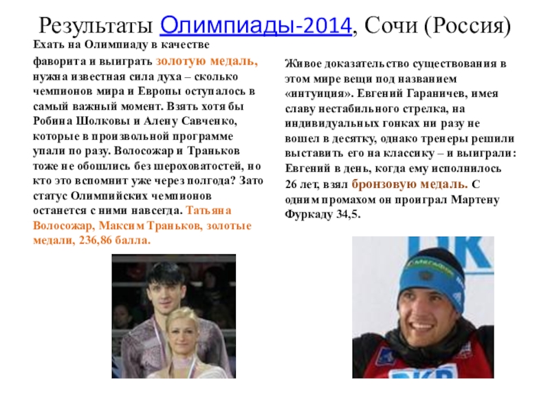 Живое доказательство существования в этом мире вещи под названием «интуиция». Евгений Гараничев, имея славу нестабильного стрелка, на индивидуальных гонках ни разу не вошел в десятку, однако тренеры решили выставить его на классику – и выиграли: Евгений в день, когда ему исполнилось 26 лет, взял бронзовую медаль. С одним промахом он проиграл Мартену Фуркаду 34,5.