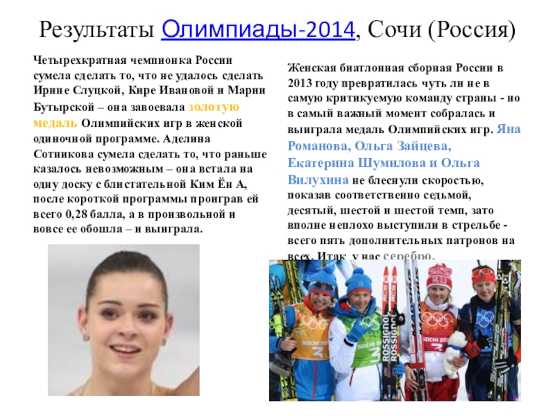 Женская биатлонная сборная России в 2013 году превратилась чуть ли не в самую критикуемую команду страны - но в самый важный момент собралась и выиграла медаль Олимпийских игр. Яна Романова, Ольга Зайцева, Екатерина Шумилова и Ольга Вилухина не блеснули скоростью, показав соответственно седьмой, десятый, шестой и шестой темп, зато вполне неплохо выступили в стрельбе - всего пять дополнительных патронов на всех. Итак у нас серебро.