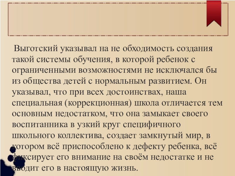 ребенок с ограниченными возможностями не исключался бы из общества детей с нормальным развитием. Он указывал, что при всех достоинствах, наша специальная (коррекционная) школа отличается тем основным недостатком, что она замыкает своего воспитанника в узкий круг специфичного школьного коллектива, создает замкнутый мир, в котором всё приспособлено к дефекту ребенка, всё фиксирует его внимание на своём недостатке и не вводит его в настоящую жизнь.