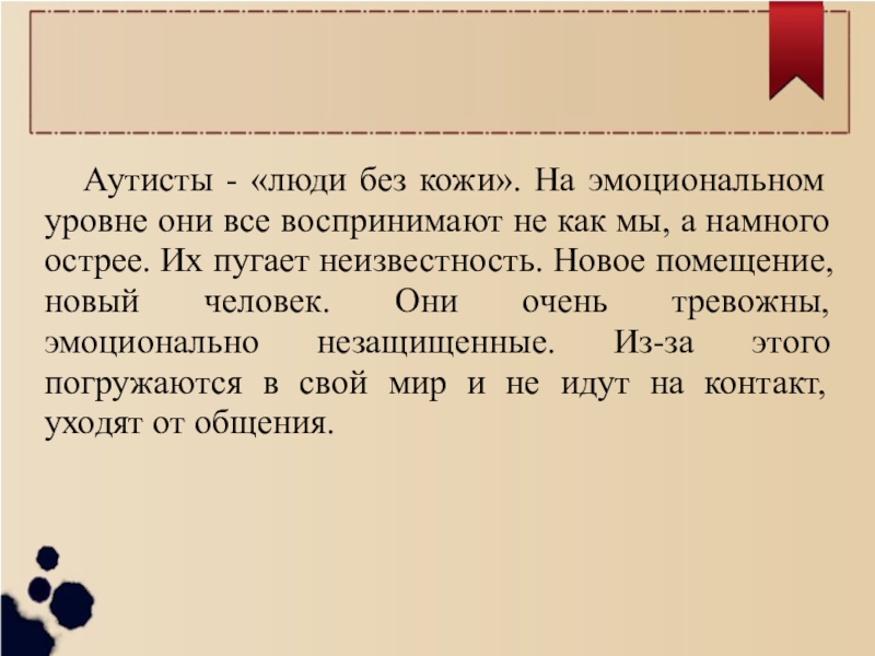 не как мы, а намного острее. Их пугает неизвестность. Новое помещение, новый человек. Они очень тревожны, эмоционально незащищенные. Из-за этого погружаются в свой мир и не идут на контакт, уходят от общения.