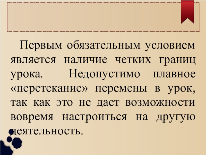 Первым обязательным условием является наличие четких границ урока. Недопустимо плавное «перетекание»