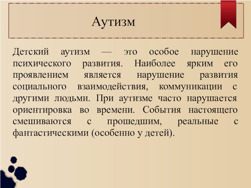 проявлением является нарушение развития социального взаимодействия, коммуникации с другими людьми. При аутизме часто нарушается ориентировка во времени. События настоящего смешиваются с прошедшим, реальные с фантастическими (особенно у детей).