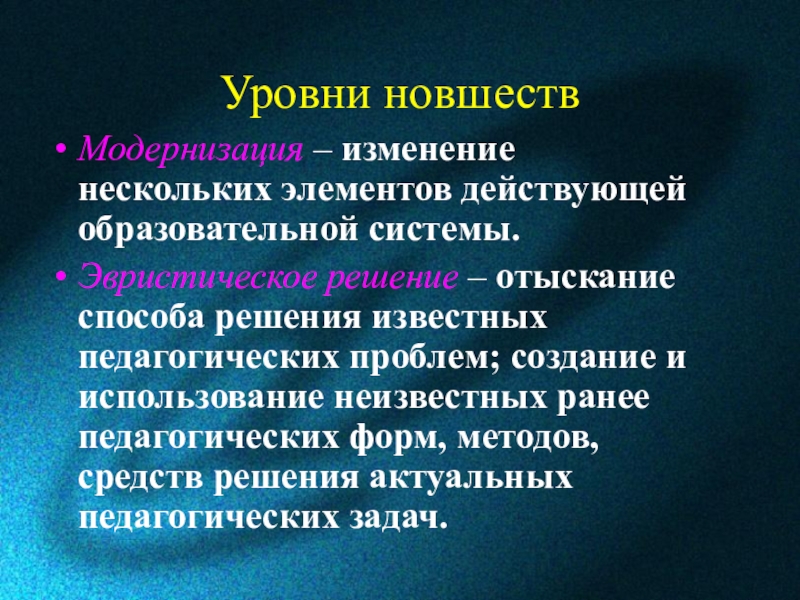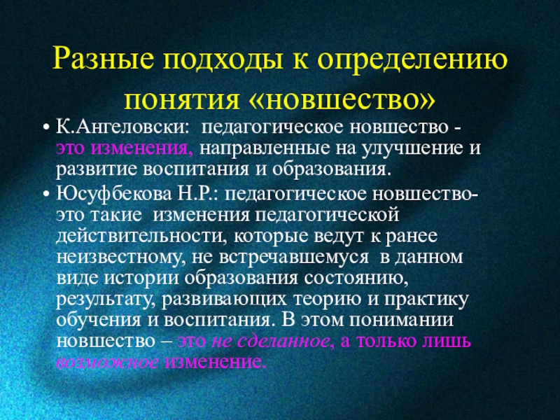 Юсуфбекова Н.Р.: педагогическое новшество-это такие изменения педагогической действительности, которые ведут к ранее неизвестному, не встречавшемуся в данном виде истории образования состоянию, результату, развивающих теорию и практику обучения и воспитания. В этом понимании новшество – это не сделанное, а только лишь возможное изменение.