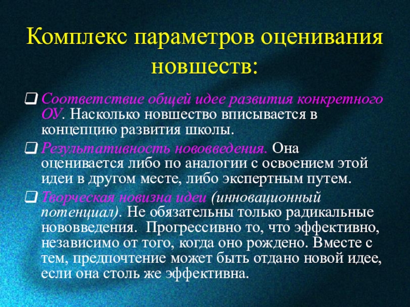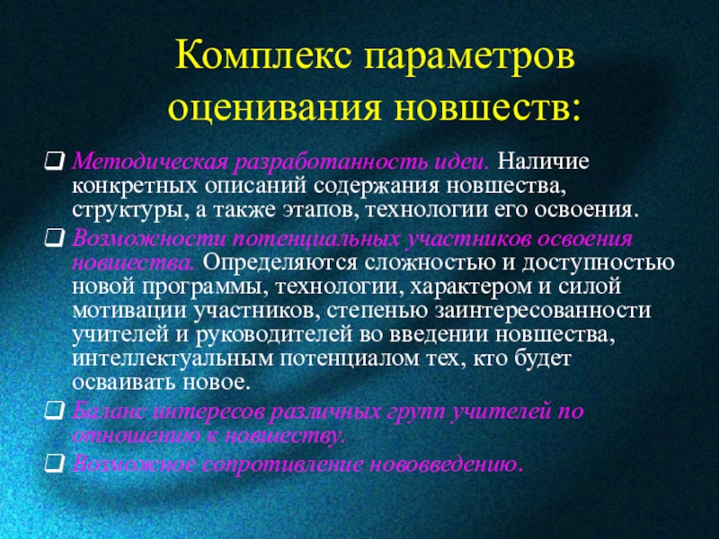 Слайд 12Комплекс параметров оценивания новшеств: