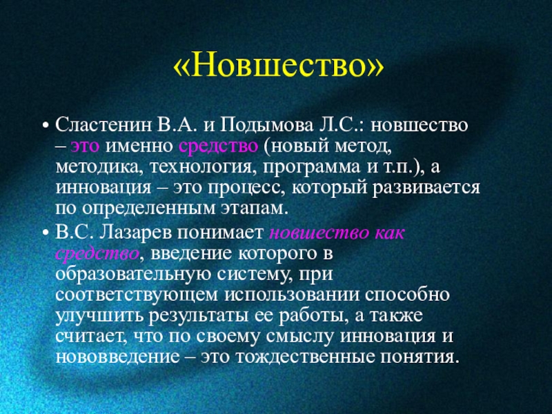 В.С. Лазарев понимает новшество как средство, введение которого в образовательную систему, при соответствующем использовании способно улучшить результаты ее работы, а также считает, что по своему смыслу инновация и нововведение – это тождественные понятия.