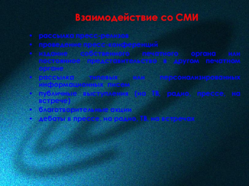 Слайд 29Взаимодействие со СМИ