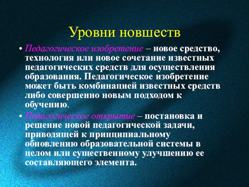 Педагогическое открытие – постановка и решение новой педагогической задачи, приводящей к принципиальному обновлению образовательной системы в целом или существенному улучшению ее составляющего элемента.