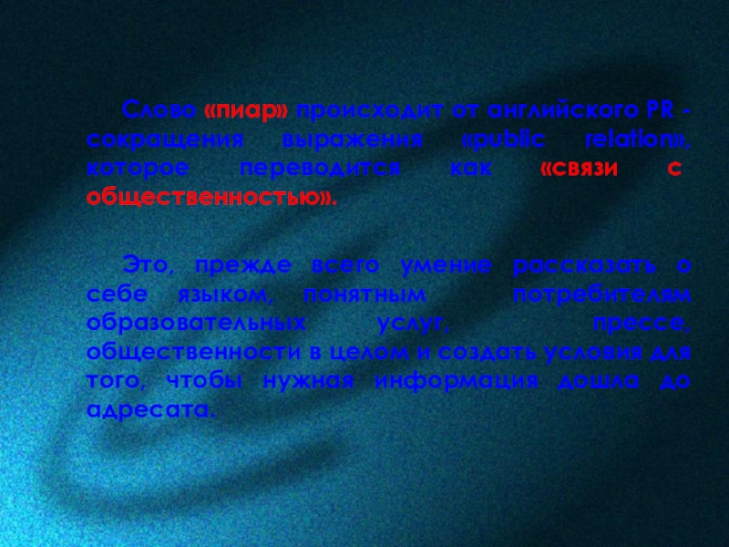 Слайд 25Слово «пиар» происходит от английского PR - сокращения выражения «public relation»,