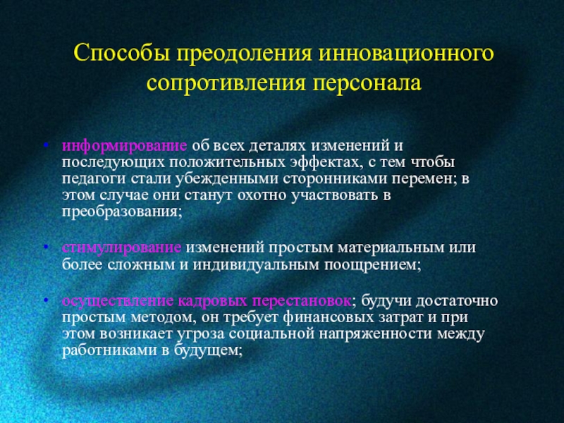 Возможности потенциальных участников освоения новшества. Определяются сложностью и доступностью новой программы, технологии, характером и силой мотивации участников, степенью заинтересованности учителей и руководителей во введении новшества, интеллектуальным потенциалом тех, кто будет осваивать новое.