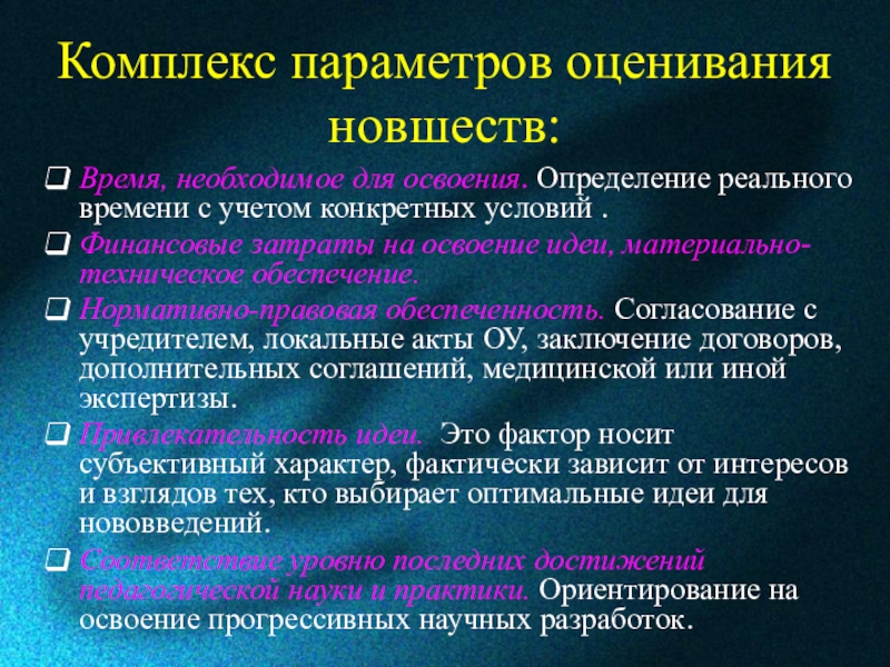 Слайд 11Комплекс параметров оценивания новшеств: