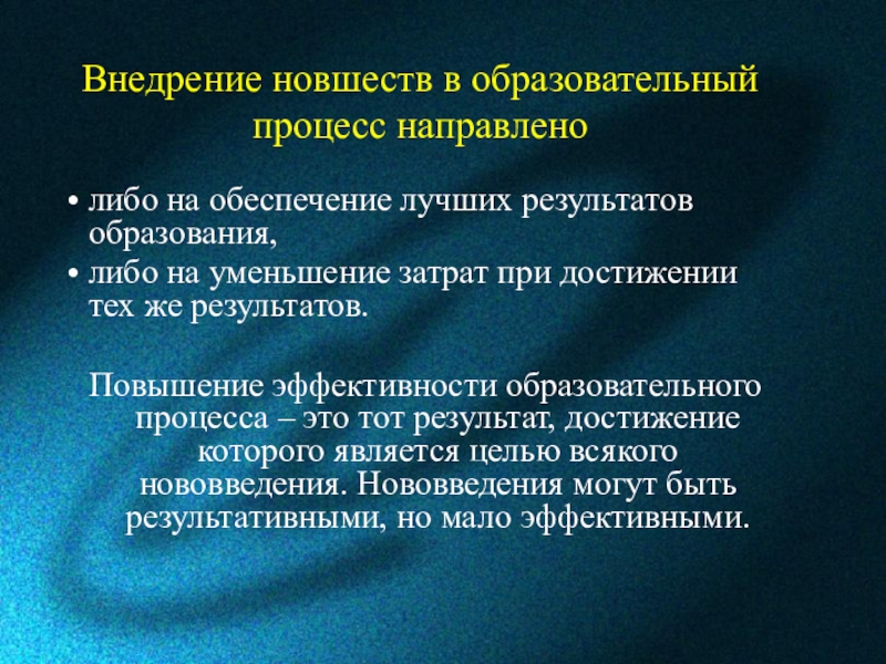 Повышение эффективности образовательного процесса – это тот результат, достижение которого является целью всякого нововведения. Нововведения могут быть результативными, но мало эффективными.